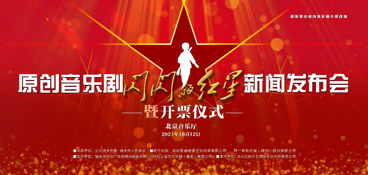 大型原創(chuàng)音樂劇《閃閃的紅星》由中共瑞金市委、瑞金市人民政府出品,深圳鼎瀚映畫文化傳播有限公司、同一首歌傳媒(贛州)股份有限公司聯(lián)合出品,由瑞金市文化廣電新聞出版旅游局、閃閃紅之星文化傳媒(瑞金)有限公司聯(lián)袂打造。首演將分兩地,10月28日、29日晚19:30在北京世紀(jì)劇院演出后,將在故事發(fā)生地、“共和國搖籃”瑞金市演出,并開始全國巡演。