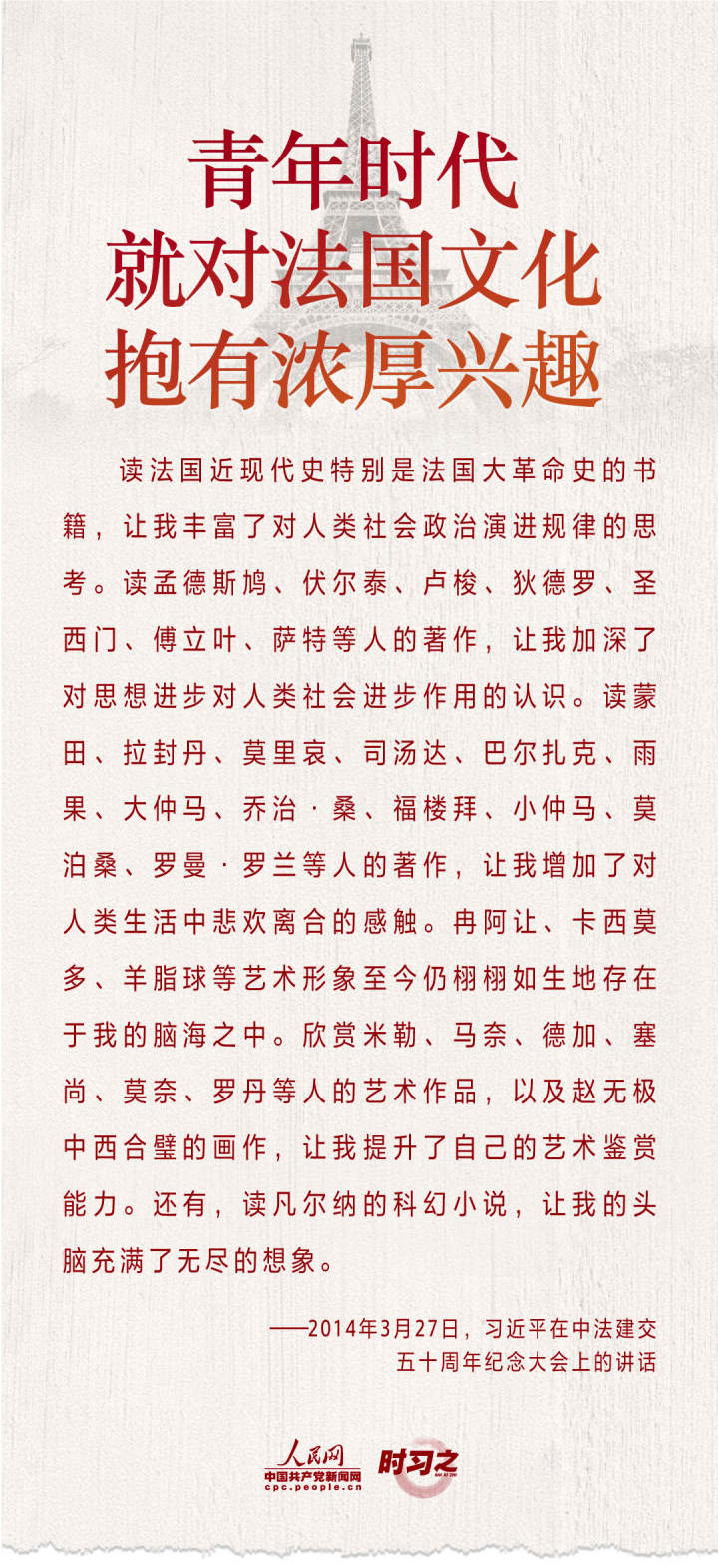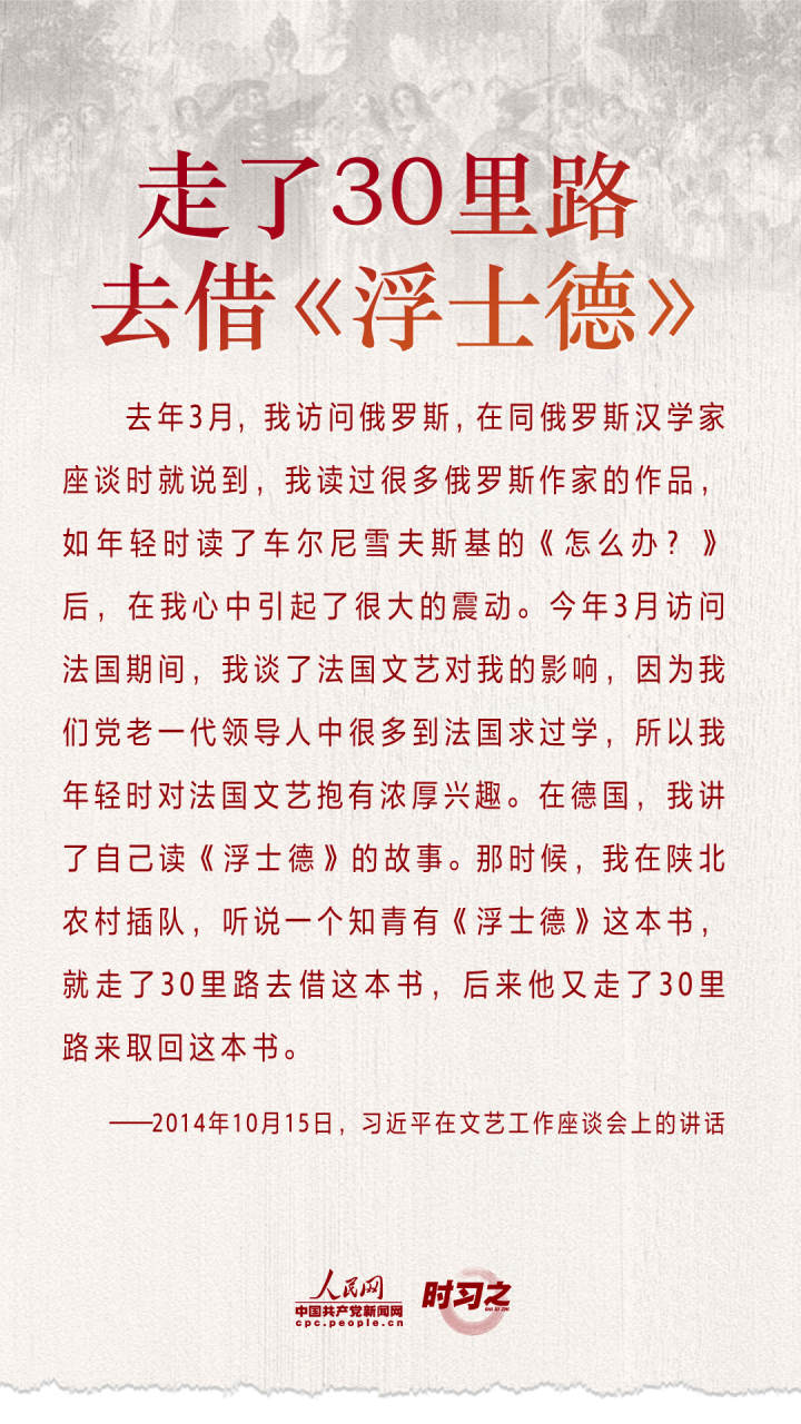 2014年10月15日,習(xí)近平總書記主持召開文藝工作座談會并發(fā)表重要講話。在講話中,習(xí)近平多次回憶起自己青年時期的閱讀史,談及多部國內(nèi)外經(jīng)典文學(xué)藝術(shù)作品。習(xí)近平在很多場合都曾表達自己對于文學(xué)藝術(shù)的喜愛,分享感悟。人民網(wǎng)·中國共產(chǎn)黨新聞網(wǎng)梳理了部分習(xí)近平講述過的他熟讀文學(xué)經(jīng)典、欣賞文藝作品的故事,以饗讀者。