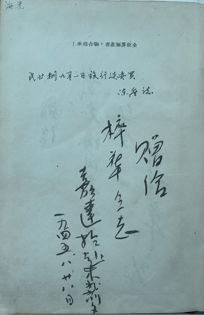 這本書原本是陳庶在1939年“旅行延安”時買下的,他在解放區(qū)的“旅行”延續(xù)了一生,終生從事對外宣傳工作。物盡其用,后來書又流轉(zhuǎn)到應(yīng)家、嘉達、劉梓華和彭志海處。在扉襯頁上留下名字的幾位,未必是赫赫有名的人物,但卻都是歷史大事件的參與者和見證者,也是歷史的創(chuàng)造者,這或許就是收藏這本書的意義所在。
