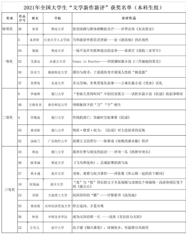 參賽的評論作品涉及2020年至2021年發(fā)表出版的文學(xué)新作,既有對莫言《晚熟的人》、余華《文城》、黎紫書《流俗地》等名家新作的評論,也關(guān)注到陳春成、班宇、路內(nèi)、王占黑等青年作家的新作,展示了新一代大學(xué)生多元開放的審美趣味和嶄新的表達(dá)風(fēng)格。