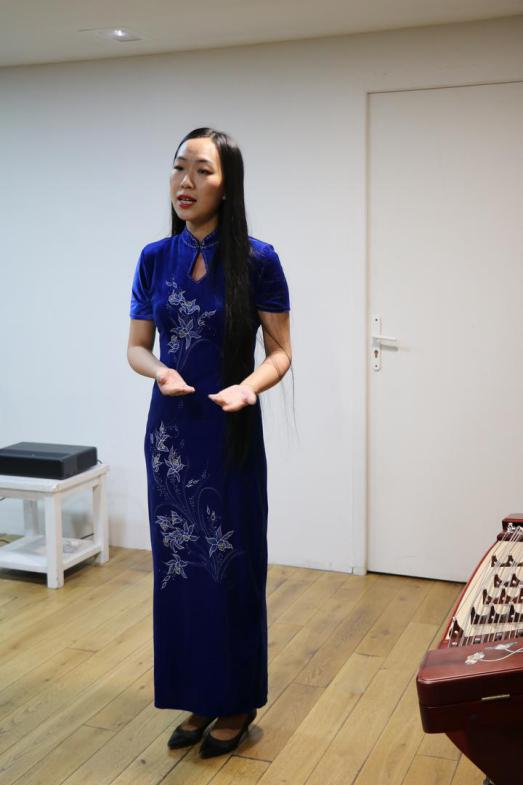 最后,揚(yáng)琴演奏家王女士演奏了中國傳統(tǒng)古曲,取材于昭君出塞故事的“妝臺(tái)秋思”和江蘇民歌“紫竹調(diào)”。