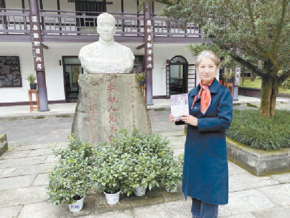 李劼人外孫女李詩(shī)華拿著《李劼人往事》在外祖父像前