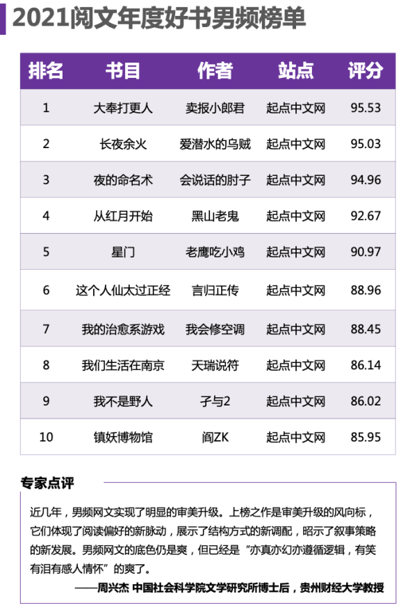 “近幾年,男頻網(wǎng)文實(shí)現(xiàn)了明顯的審美升級?!?中國社會科學(xué)院文學(xué)研究所博士后、貴州財經(jīng)大學(xué)教授周興杰評價,《2021閱文年度好書榜》的男頻榜單,客觀反映了好書品質(zhì),網(wǎng)文的腦洞要大,邏輯要通,才能受人追捧。盡管男頻網(wǎng)文底色未變,但實(shí)現(xiàn)“爽”的方式以及“爽”的耐受有了明顯拔高,已經(jīng)是“亦真亦幻亦遵循邏輯,有笑有淚有感人情懷”的爽了。