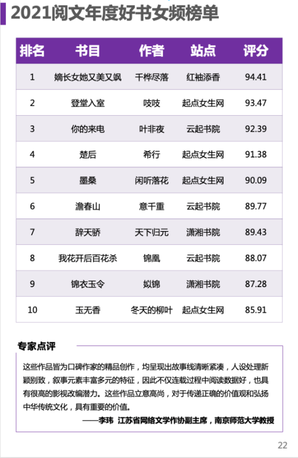 “上榜女頻作品均呈現(xiàn)出故事線清晰緊湊,人設(shè)處理新穎別致,敘事元素豐富多元的特征,因此不僅連載過程中閱讀數(shù)據(jù)好,也具有很高的影視改編潛力。這些作品立意高尚,對于傳遞正確的價值觀和弘揚(yáng)中華傳統(tǒng)文化,具有重要的價值?!?江蘇省網(wǎng)絡(luò)文學(xué)作協(xié)副主席、南京師范大學(xué)教授李瑋評價。