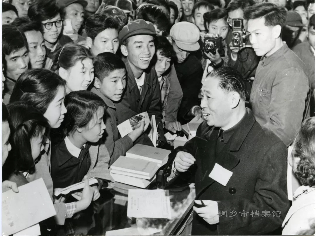 1957年11月7日,新華書(shū)店為紀(jì)念和慶祝十月革命四十周年,在勞動(dòng)人民文化宮舉辦露天書(shū)市,茅盾應(yīng)邀參加并為讀者簽名留念。(桐鄉(xiāng)市檔案館藏)