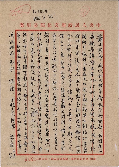 展品中含有20余通未被《茅盾全集》《茅盾全集·補(bǔ)遺》或《茅盾書(shū)信集》等收錄的信札,包括茅盾致蕭三書(shū)簡(jiǎn)11通,致陳白塵、沙博理、普實(shí)克、柯靈等人共十余通;另有桐鄉(xiāng)市檔案館傾情提供的茅盾珍貴手稿及照片,首次在北京公開(kāi)展示。這些極其珍貴的手稿,對(duì)促進(jìn)茅盾生平、思想及其作品的研究,對(duì)促進(jìn)我國(guó)建黨初期革命文藝的研究,都具有十分重要的意義。