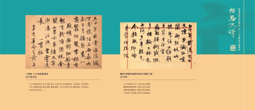 茅盾先生是文人書(shū)法中的“瘦硬”者最為典型的代表之一。茅盾一生勤于著述,始終保持著使用毛筆書(shū)寫(xiě)的習(xí)慣,無(wú)論是辦公室,還是家中書(shū)房,毛筆、硯臺(tái)都是他的案頭常物。茅盾從來(lái)不認(rèn)為自己是書(shū)法家,這其實(shí)代表了他們那一代文人整體的價(jià)值觀:年輕的時(shí)候要多做學(xué)問(wèn),寫(xiě)字應(yīng)該是業(yè)余的,但寫(xiě)字好這是最基本的。此次手跡展擷取了部分代表性手稿制成條幅,力圖呈現(xiàn)出茅盾先生手跡的基本面貌。欣賞茅盾先生的手跡,不僅能感受到歷史的脈動(dòng),也能收獲豐沛的藝術(shù)享受。
