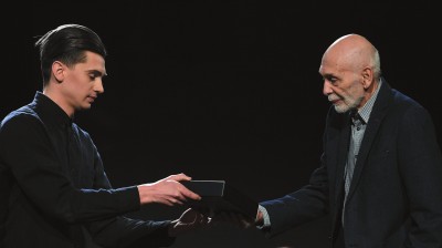 列昂尼德·優(yōu)素福維奇(右)接過第十六屆大書獎的獎牌。攝影:瓦列里·梅利尼科夫