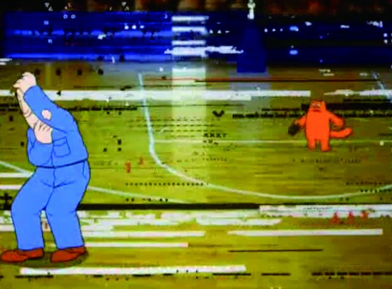 在卡通世界中,導(dǎo)演運(yùn)用傳統(tǒng)的二維動(dòng)畫,配合卡通繪制或?qū)嵟膱D片構(gòu)成的場(chǎng)景,來(lái)突出這個(gè)世界和平面世界之間的區(qū)別。美術(shù)風(fēng)格的差異不僅為原本普通的故事情節(jié)增添了別樣的色彩,還為故事的關(guān)鍵轉(zhuǎn)折點(diǎn)提供了情節(jié)設(shè)計(jì)上的靈活性和更多的可能性。