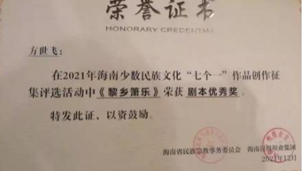 1月9日,2021年海南省少數(shù)民族文化“七個(gè)一”作品創(chuàng)作征集評選活動(dòng)在海口舉行頒獎(jiǎng)禮,全國少兒科幻聯(lián)盟作家柯漁(本名方世飛)的海南黎族傳統(tǒng)文化題材劇本《黎鄉(xiāng)簫樂》榮獲劇本優(yōu)秀獎(jiǎng)。