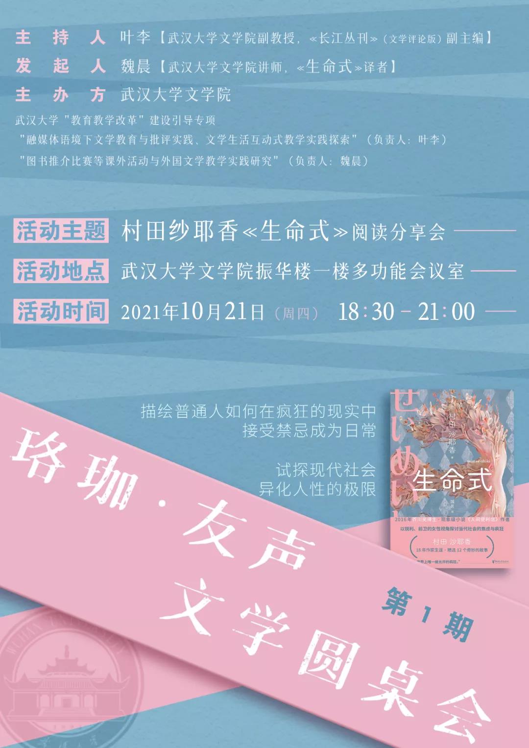 2021年10月22日,在武漢大學(xué)文學(xué)院,舉辦了“珞珈·友聲”文學(xué)圓桌會(huì)。來(lái)自包括武漢大學(xué)、華中科技大學(xué)、湖北警官學(xué)院的高校師生,圍繞村田紗耶香的最新短篇小說(shuō)集《生命式》展開(kāi)討論,分享了各自閱讀體驗(yàn)。