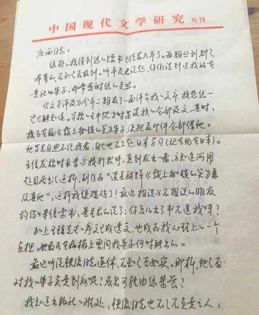 我去年十月在《上海文學(xué)》發(fā)一論文,不料有些效果。汪曾祺與張兆和先生(沈從文夫人)輾轉(zhuǎn)帶信兒過來,索要此文,使我受寵若驚。繼而,上海文學(xué)蔡、楊兩兄突來信說,拙文被評為上海文學(xué)獎。如果可能,我五月份在與季紅真陪臺灣某人去湘西前后,會去上海一次,這便使我想起那次與您在建國西路同住時的愉快。兄能在五月初簡 復(fù)我一信以免我懸念嗎?