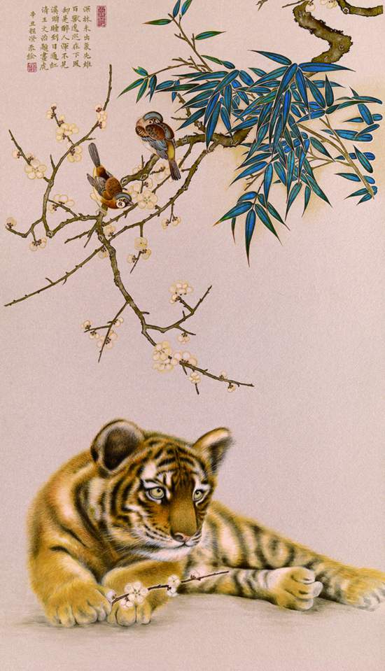 此外,程澄的畫(huà)中,與虎相伴的,有花草,有鳥(niǎo),有蝴蝶,有螳螂,有世間蓬勃的生命,有我們看不到的空氣與尋常日光以及心情。這是春融溫暖的,我們能感受到畫(huà)中吹來(lái)的看不見(jiàn)的風(fēng);這是愜意的,古意斑斕中有著寧?kù)o與祥和。所以,程澄畫(huà)虎,畫(huà)的是安寧,吉祥,畫(huà)的是瑞意,紫氣,畫(huà)的是憨、萌、癡、拙、善的虎娃百態(tài),這又何嘗不是人間百態(tài)。
