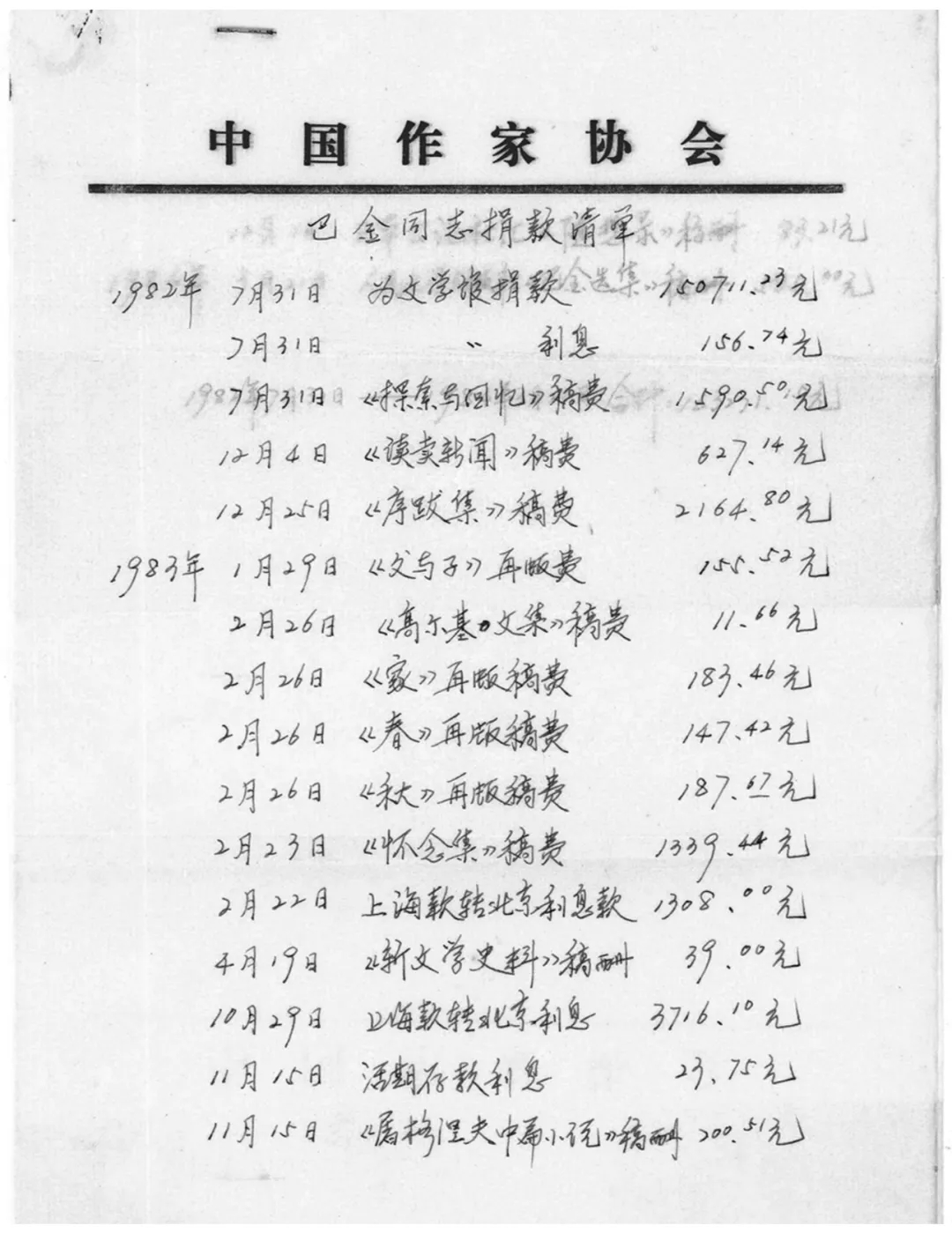巴金為中國現(xiàn)代文學(xué)館部分捐款清單