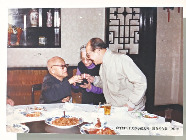 從此,張?jiān)屎?、周有光,因?yàn)槔デ顒?dòng),常與俞平伯夫婦來往,還曾專門為俞平伯慶祝九十歲大壽。