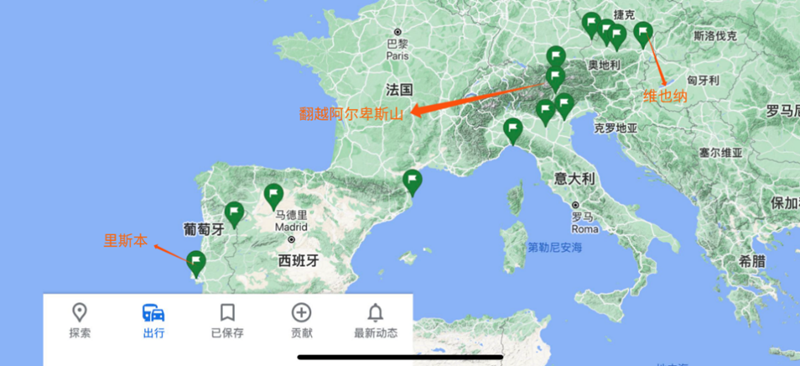 1550年8月中旬 里斯本——羅德里格堡(castelo Rodrigo 葡萄牙)——巴拉多利德(西班牙)——羅薩斯港(靠近法國邊境)(坐船)——熱那亞(意大利)——曼圖瓦(意大利倫巴第)—維羅納(意大利)——帕多瓦——特倫托——開始登阿爾卑斯山——博爾扎諾——布里克森——穿過布倫納山口——到達因斯布魯克(奧地利)(1552年主顯節(jié) 1月6日)——沿著茵河一路往下——帕紹(德國)——沿著多瑙河——林茨——阿姆施泰滕——梅爾克——奧地利(制圖:鄧潔舲)