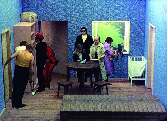根據(jù)瑞比克金斯基的公司官網(wǎng)資料顯示,為了創(chuàng)作《探戈》,他花費了大量精力進行人工逐幀處理——手動摳像,再手動合成。這難免會使這部短片的視覺效果有一定瑕疵。瑞比克金斯基自己坦言,人物周圍有可見的黑色邊線,膠片材料的不穩(wěn)定也導致了抖動,燈光色溫的波動影響了顏色的統(tǒng)一。為了讓36個人的行動軌跡在狹小的房間里互不影響,瑞比克金斯基對人物的姿態(tài)序列在時間軸上進行了微調(diào),于是《探戈》最后呈現(xiàn)出角色動態(tài)有時略快、有時略慢的狀況。也正因為這個原因,雖然筆者更愿意將其歸為以實拍為基底的作品,但畢竟它踩在了動畫與實拍兩種影像類別的邊線上——瑞比克金斯基自己甚至將其稱作“實拍動畫”(live action animation)這種怪名字——因此在這里我們不妨以動畫視角來審視該短片。