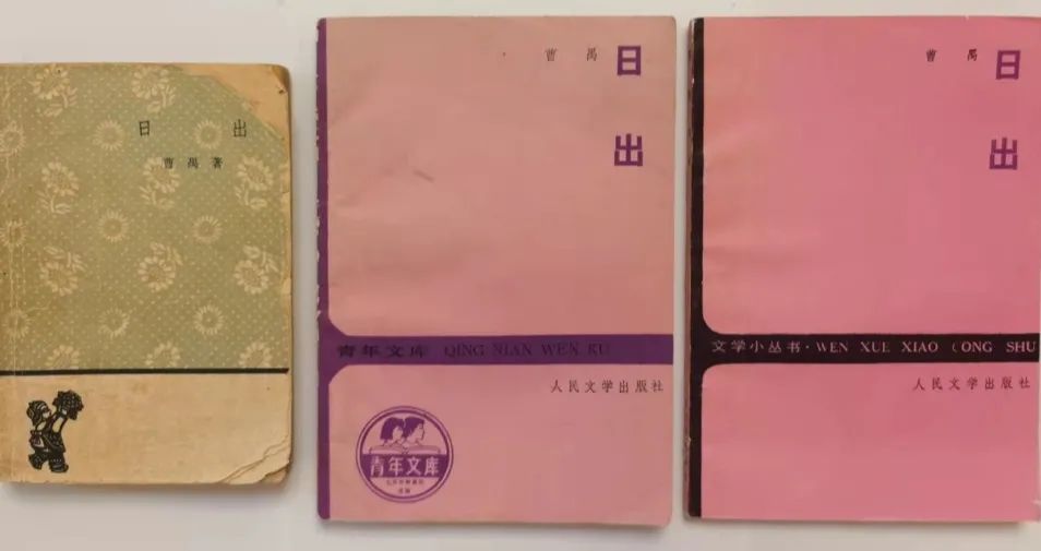 左:“小叢書”版《日出》1959年12月北京第1版第1次印刷;中:“青年文庫”叢書《日出》1959年12月北京第1版,1990年8月北京第1次印刷;右:“文學(xué)小叢書”《日出》1959年12月北京第1版,1992年12月北京第2次印刷。