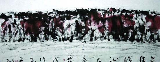 生命的風(fēng)景,我是從多達數(shù)十幅不同主題的草原風(fēng)光中看到的。如《套馬桿》(2010)、《草原的節(jié)日》(2012)、《那達慕開幕式》(2013)、《摔跤手出場》(2013)、《烏珠穆沁大馬群》(2018)等。《草原的節(jié)日》寥寥數(shù)筆,一組蒙古漢子歡快地搭肩踢腿舞蹈得以呈現(xiàn),看著他們,就像聽到了踏著節(jié)拍的強烈節(jié)奏?!端邮殖鰣觥肪€條多了不少,摔跤手甩開的長袍、飄起的衣襟、雄健的跨步,傳遞出他旺盛的生命力。137*309厘米的大幅作品《烏珠穆沁大馬群》中,馬匹繪滿了畫面,既看不出馬群是向人前踏行,也看不出馬群是向天邊飛馳,但是,就是令人感到馬群的巨大生命力!或許畫家正是通過模糊的、聚集的、色彩不一的馬匹,傳遞了草原上健康的旺盛的熱烈的生命。