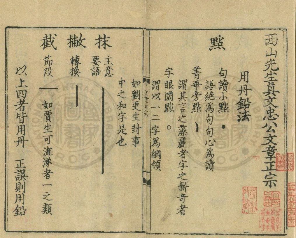 在中國古代文學(xué)批評的諸多樣式中,評點(diǎn)是批評者與讀者關(guān)系相當(dāng)緊密的一種類型。關(guān)于評點(diǎn)之學(xué),章學(xué)誠曾指出,“自學(xué)者因陋就簡,即古人之詩文而漫為點(diǎn)識批評,庶幾便于揣摩誦習(xí)”3,強(qiáng)調(diào)其功能在于指示法門以便效仿學(xué)習(xí)。由此也可見出,文章圈點(diǎn)法不僅關(guān)系到古代文法之授習(xí),更涉及文章誦讀的問題。從歷史上看,文章圈點(diǎn)法是在南宋伴隨著《古文關(guān)鍵》《文章軌范》等文章總集的編刻而發(fā)展成熟的。葉德輝《書林清話》“刻書有圈點(diǎn)之始”條云:“刻本書之有圈點(diǎn),始于宋中葉以后。岳珂《九經(jīng)三傳沿革例》有‘圈點(diǎn)必?!Z,此其明證也?!秾O記》宋版《西山先生真文忠公文章正宗》二十四卷,旁有句讀圈點(diǎn)……坊估刻以射利,士林靡然向風(fēng)。有元以來,遂及經(jīng)史?!?葉德輝所記宋版《文章正宗》已有句讀圈點(diǎn),高津孝《宋元評點(diǎn)考》一文曾對此進(jìn)行考察,指出“臺灣‘中央圖書館’所藏的宋末元初建安刊《西山先生真文忠公文章正宗》……宋末元初刊部分有句讀點(diǎn)、聲點(diǎn),也有圈點(diǎn)、抹”5。此本卷首《用丹鉛法》,記載了書中圈點(diǎn)運(yùn)用的凡例: