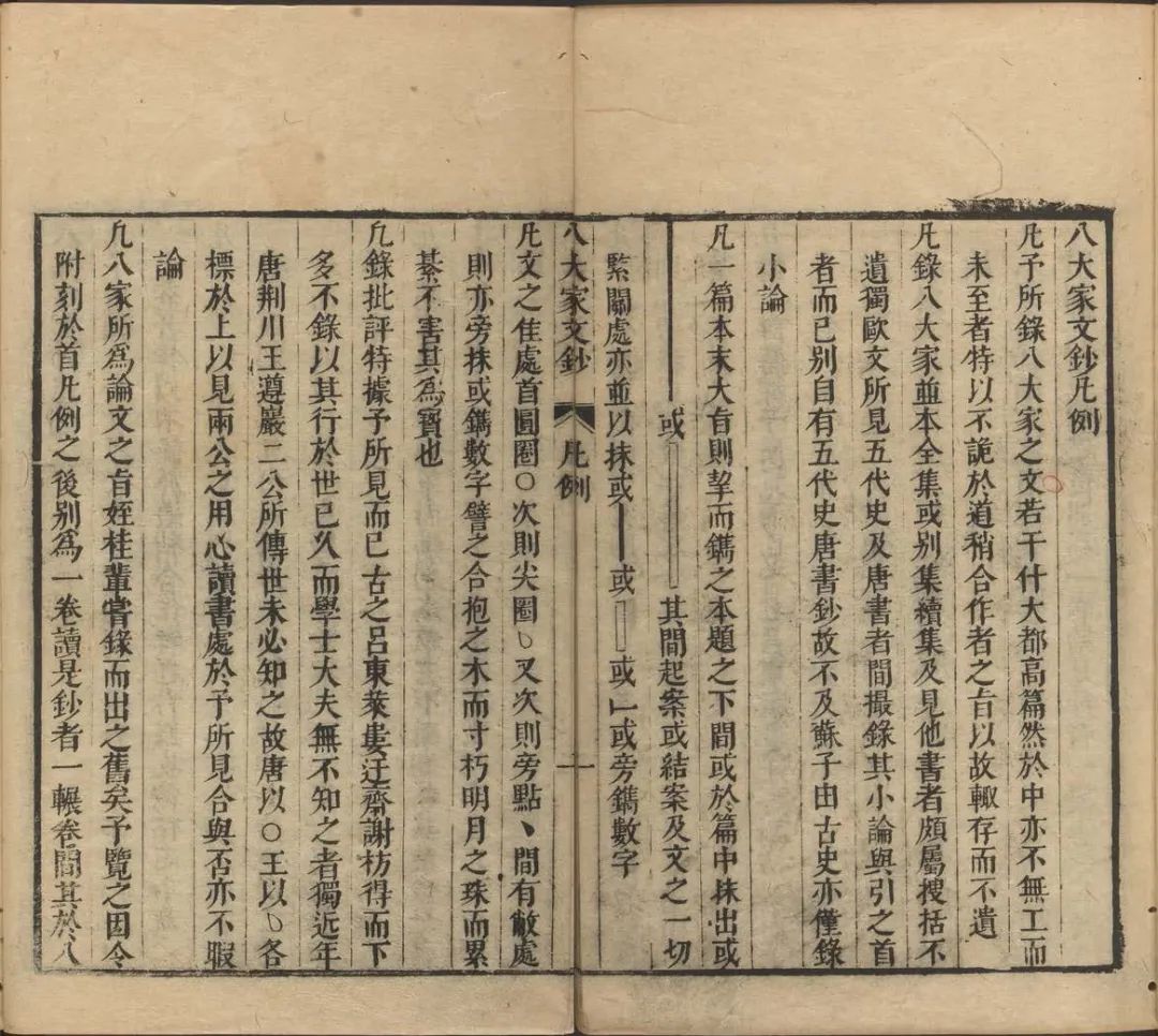 明代的文章圈點(diǎn)之法總體上既有對南宋呂東萊、謝疊山圈點(diǎn)法的承襲,也有著因文章學(xué)之發(fā)展而產(chǎn)生的新變。首先就承襲所謂“古法”而言,從明代前中期的文評、文章總集等文獻(xiàn)來看,南宋文章圈點(diǎn)及閱讀理論在明代仍有著相當(dāng)程度的影響。明初曾鼎編纂的《文式》,卷下即列有“呂祖謙東萊《古文關(guān)鍵》” 10,收錄上引《古文關(guān)鍵》卷首《總論看文字法》,以作為讀文規(guī)矩、作文繩墨的一部分。再如歸有光《文章指南》,卷首所列《歸震川先生總論看文法》11,實(shí)則也照搬自呂氏《總論看文字法》。至于圈點(diǎn)法的沿用,最明顯的例子是徐師曾所編《文體明辨》,此書前有《文章綱領(lǐng)》一卷,在收錄諸家論文語之后,附有《宋真德秀批點(diǎn)法》,亦即上引《文章正宗》卷首《用丹鉛法》,此后又附《大明唐順之批點(diǎn)法》12,收錄的是本朝唐順之的圈點(diǎn)法。茅坤《唐宋八大家文鈔》卷首《凡例》同樣提到了南宋諸家的圈點(diǎn)法,特別指出此書不輯錄呂祖謙、樓昉、謝枋得以來的“古法”,“以其行于世已久,而學(xué)士大夫無不知之者。獨(dú)近年唐荊川、王遵巖二公所傳,世未必知之。故唐以○、王以△,各標(biāo)于上,以見兩公之用心讀書處”13。從這段表述中既可看出南宋諸家圈點(diǎn)法在當(dāng)時的流行程度,也可見出《唐宋八大家文鈔》欲將唐、王圈點(diǎn)法推而廣之的編纂意圖。