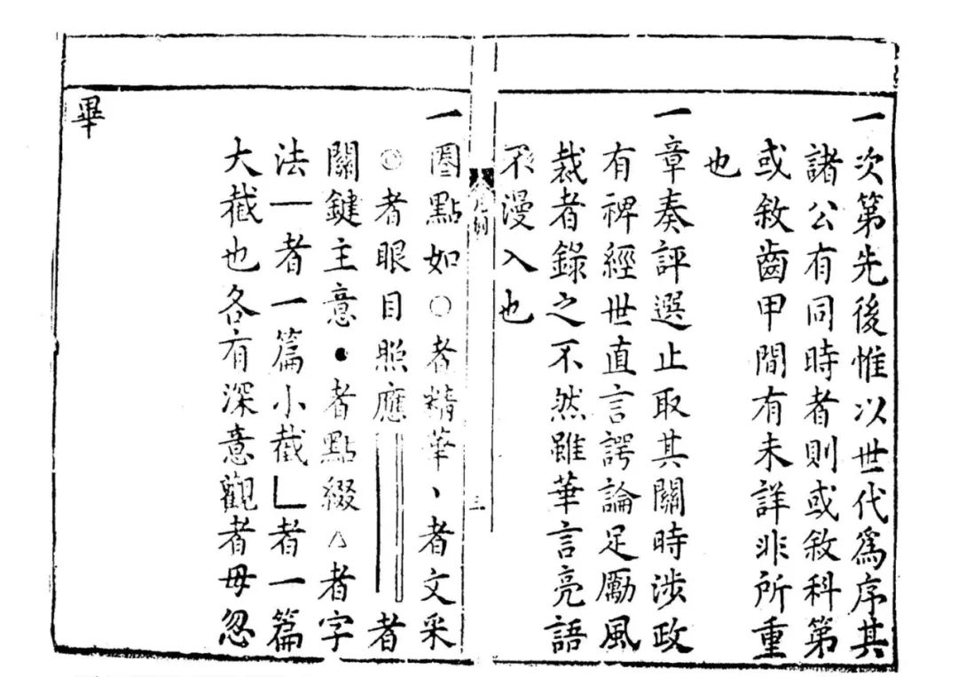 一是以圈點(diǎn)符號來標(biāo)示選文的評價等級。例如晚明的舉業(yè)用書《新鐫選釋歷科程墨二三場藝府群玉》,由衢州書坊翁日新刻印。此書署焦竑、王衡同選,唐汝瀾注,邵名世、王時學(xué)同校,翁日新繡梓。焦竑、王衡之名當(dāng)系偽托,實(shí)際的編選、注釋工作應(yīng)由唐汝瀾承擔(dān)。唐汝瀾對所選科考二三場中論、表、判、策程墨的等級評選,皆以圈點(diǎn)作為標(biāo)示。對此,書前《新鐫選釋歷科程墨二三場群玉圈點(diǎn)凡例》有清晰的說明: