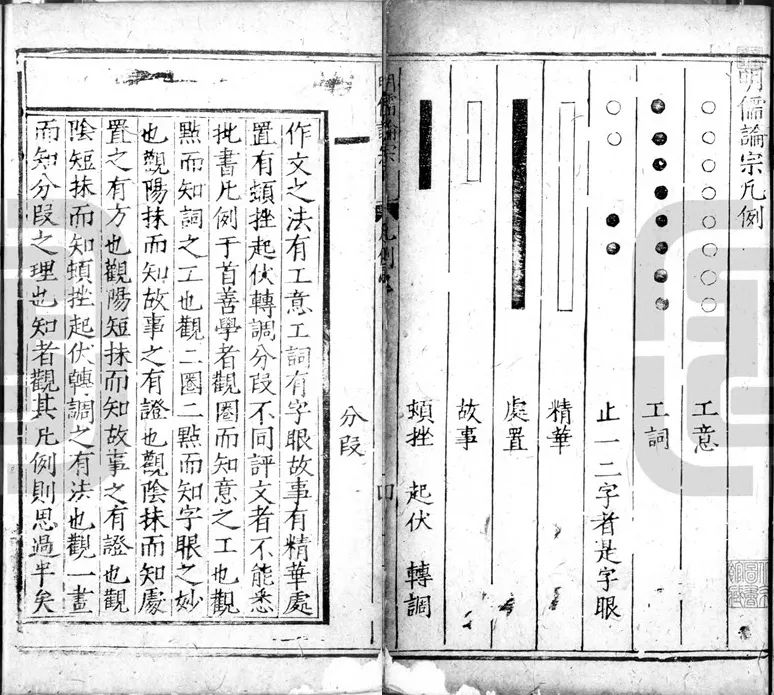 作文之法,有工意、工詞,有字眼、故事,有精華、處置,有頓挫、起伏、轉(zhuǎn)調(diào)、分段不同。評文者不能悉批,書凡例于首。善學(xué)者,觀圈而知意之工也,觀點(diǎn)而知詞之工也,觀二圈二點(diǎn)而知字眼之妙也,觀陽抹而知故事之有證也,觀陰抹而知處置之有方也,觀陽短抹而知故事之有證也,觀陰短抹而知頓挫、起伏、轉(zhuǎn)調(diào)之有法也,觀一畫而知分段之理也。知者觀其凡例,則思過半矣。29
