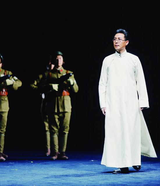 憶魯迅。主創(chuàng)將主人公被捕之前,魯迅與之“人生得一知己足矣,斯世當(dāng)以同懷視之”的深切情誼,將主人公被捕之后魯迅的憂心,“惟慟惟悼,知己平生,永墜寒宵,滿眼鴟鸮”,以及未來魯迅必將完成的主人公譯著結(jié)集(即不久之后,由魯迅親自編輯整理,以諸夏懷霜社名義出版的《海上述林》,其中收有諸種馬克思主義經(jīng)典作品的中譯文)熔鑄在一起,特別在舞臺上再現(xiàn)了這對文學(xué)雙璧同框的十分珍貴的歷史畫面。就在這幅畫面里,魯迅誦讀主人公的這段話“燃燒火焰,橫掃穢世,此種為將來,為大眾之精神,不懼犧牲,貫穿始終,永是如此”(《魯迅雜感選集序言》),這既是對魯迅的崇高贊美,又是主人公作為革命者自我情懷的表白。這又為下一折實(shí)寫之戲,即宋希濂示以蔣介石屠殺令,曲解《多余的話》,誘惑主人公放棄信仰,夯實(shí)了主人公視死如歸,對馬克思主義偉大信念“永是如此”,堅(jiān)若磐石的基礎(chǔ)。(順便說一句,作為文學(xué)雙璧的展現(xiàn),此折尚欠厚重)