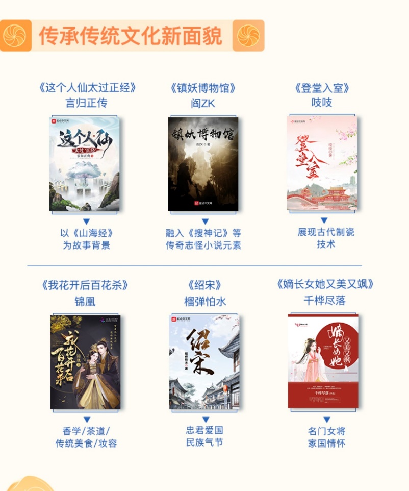 中國(guó)故事既要記錄當(dāng)下也要立足傳統(tǒng)。報(bào)告指出,網(wǎng)絡(luò)文學(xué)發(fā)端于傳奇話(huà)本、明清小說(shuō),中國(guó)古典文學(xué)的基因根植其中。2021年,網(wǎng)絡(luò)文學(xué)對(duì)傳統(tǒng)文化的繼承和發(fā)揚(yáng)呈現(xiàn)新特征:第一,主動(dòng)調(diào)動(dòng)傳統(tǒng)文化寶庫(kù)和古典文學(xué)資源,并將傳統(tǒng)文化與現(xiàn)代精神相結(jié)合;第二,主人公的個(gè)人奮斗與家國(guó)敘事相結(jié)合。隨著年輕一代在快速發(fā)展的敘事下崛起,國(guó)際局勢(shì)的變化和民族自豪感的提升,網(wǎng)絡(luò)文學(xué)的“俠義精神”和包裹在古典表達(dá)下的精神內(nèi)核也發(fā)生轉(zhuǎn)向,主人公的個(gè)人奮斗再度與家國(guó)敘事相結(jié)合。比如以《山海經(jīng)》《搜神記》為故事背景的《鎮(zhèn)妖博物館》;塑造新版名門(mén)女將群像,喚起讀者對(duì)家國(guó)命運(yùn)關(guān)注的作品《嫡長(zhǎng)女她又美又颯》。