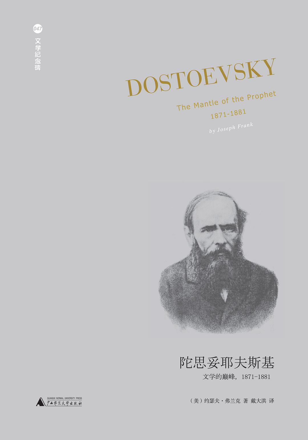 廣西師范大學(xué)出版社的“文學(xué)紀念碑”叢書(魏東主持)于2014年推出約瑟夫·弗蘭克的五卷本《陀思妥耶夫斯基》傳記,最后一卷是《陀思妥耶夫斯基:文學(xué)的巔峰,1871-1881》(原書名Dostoevsky:The Mantle of the Prophet,1871 -1881,2002;戴大洪譯,廣西師范大學(xué)出版社,2022年3月)?;突臀宕缶?、總共近四千頁的陀思妥耶夫斯基傳記,可以不夸張地說,這是“文學(xué)紀念碑”中那座最宏偉的碑,是文學(xué)與思想、理想與信仰之間最深邃的幽谷,其意義遠超出一般的文學(xué)翻譯出版項目。