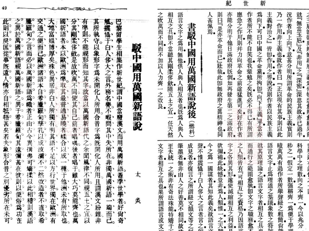 1908年,章太炎和吳稚暉等人就“萬(wàn)國(guó)新語(yǔ)”問(wèn)題展開(kāi)論戰(zhàn),圖為章太炎《駁中國(guó)用萬(wàn)國(guó)新語(yǔ)說(shuō)》和吳稚暉《書(shū)駁中國(guó)用萬(wàn)國(guó)新語(yǔ)說(shuō)后》,分別發(fā)表于該年《民報(bào)》21期和《新世紀(jì)》第57期