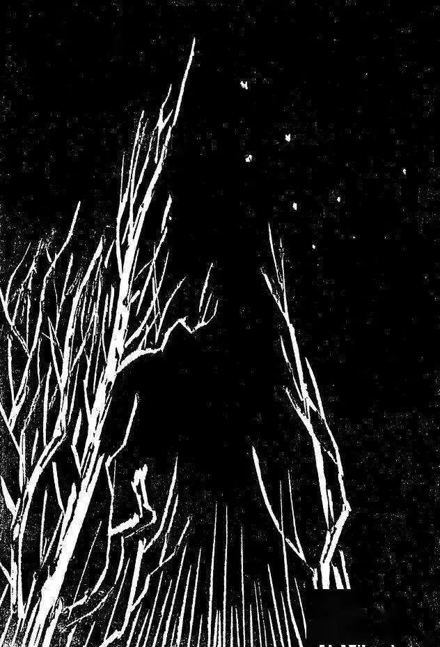 與“低亞著”的“幾枝”相比,“最直最長(zhǎng)的幾枝”卻呈現(xiàn)出另外的形態(tài),且與“天空”構(gòu)成了尖銳的對(duì)峙:“默默地鐵似的直刺著奇怪而高的天空,使天空閃閃地鬼?眼;直刺著天空中圓滿的月亮,使月亮窘得發(fā)白。”