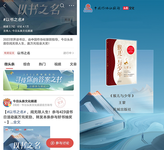 與今日頭條文化頻道發(fā)起的“以書之名”世界讀書日特別活動(dòng),開展讀書征文、發(fā)表閱讀心得,目前話題全網(wǎng)閱讀量已突破3億,4.6萬(wàn)人參與討論。