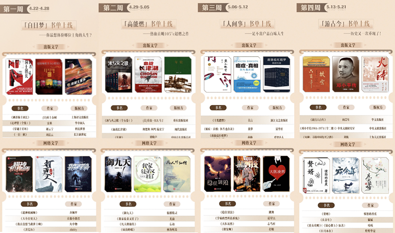 為迎接即將到來(lái)的第27個(gè)世界讀書日,閱文集團(tuán)聯(lián)合國(guó)家圖書館、上海圖書館以及人民文學(xué)出版社、人民郵電出版社、北京大學(xué)出版社、中國(guó)青年出版總社等100家出版單位共推全民閱讀。4月22日至5月21日,閱文集團(tuán)旗下起點(diǎn)讀書APP開啟“全民閱讀月”,首次限免200本付費(fèi)好書,覆蓋文學(xué)、小說(shuō)、傳記、經(jīng)濟(jì)等20余大品類。國(guó)家圖書館文津圖書獎(jiǎng)部分好書也將同步限時(shí)免費(fèi)開放。