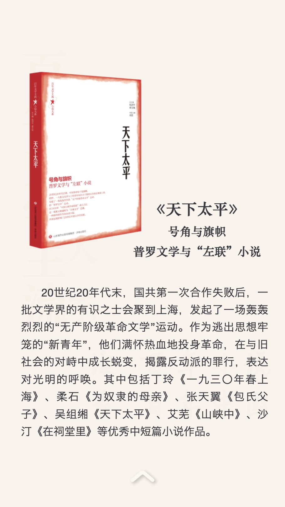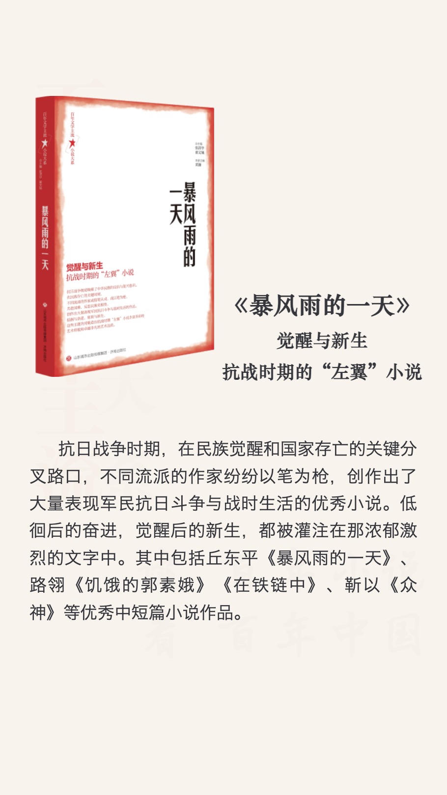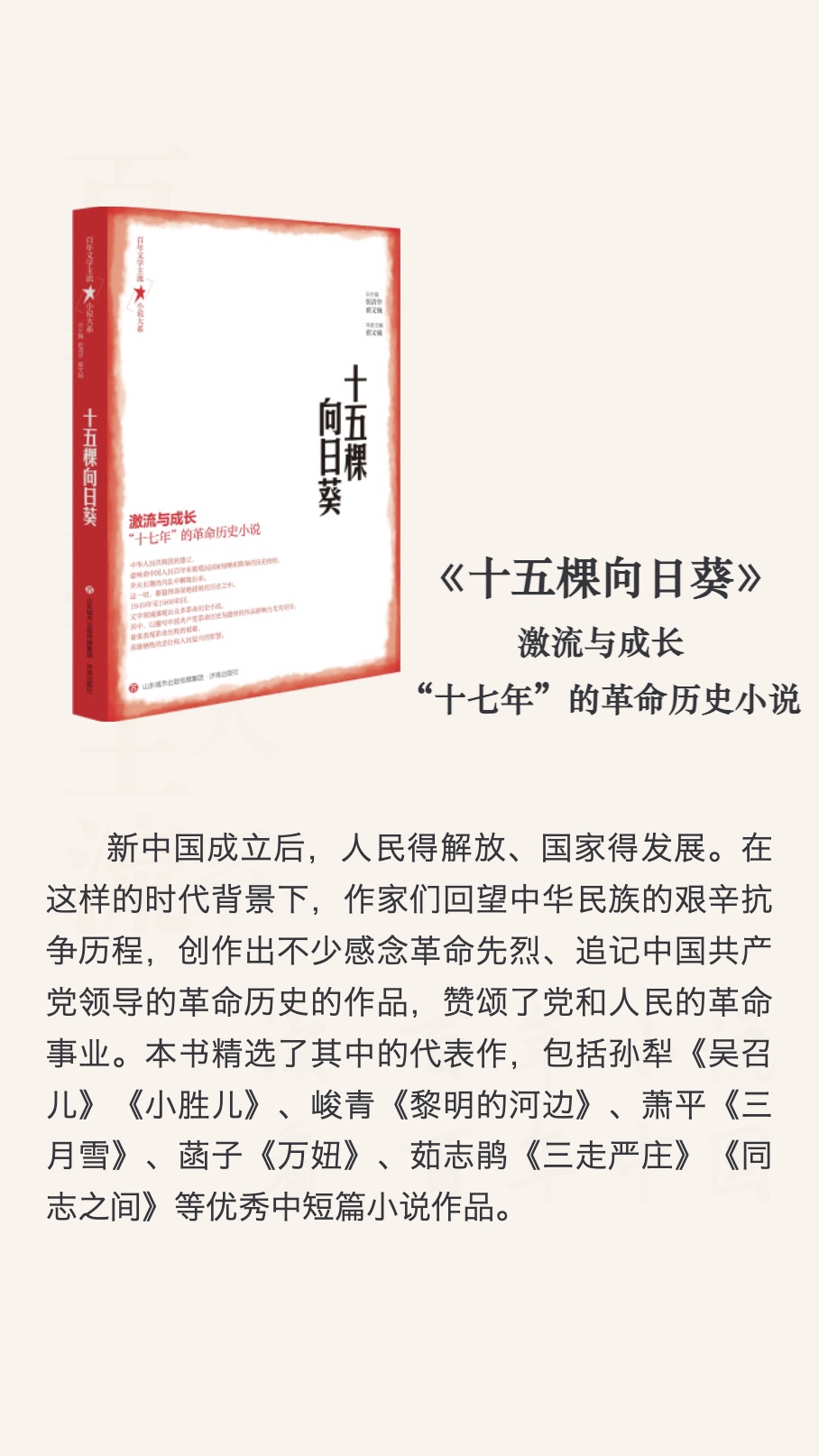 叢書受到文學(xué)史典范著作《十九世紀(jì)文學(xué)主流》啟發(fā),容納一個世紀(jì)中最具代表性的作家作品,以歷史時間為線索,依循文學(xué)史演變的軌跡,遴選與社會進步的洪流匯通呼應(yīng)的作品百余篇?!按笙怠币?949年為界,分成“現(xiàn)代部分”和“當(dāng)代部分”兩編,每編分5卷。各卷以所涉時期內(nèi)代表作品為卷名,分別為:第一卷《天下太平》(普羅文學(xué)與“左聯(lián)”小說)、第二卷《沒有祖國的孩子》(“東北作家群”小說)、第三卷《暴風(fēng)雨的一天》(抗戰(zhàn)時期的“左翼”小說)、第四卷《喜事》(解放區(qū)的翻身小說)、第五卷《一顆未出膛的槍彈》(解放區(qū)的戰(zhàn)爭小說)、第六卷《喜鵲登枝》(“十七年”的合作化小說)、第七卷《十五棵向日葵》(“十七年”的革命歷史小說)、第八卷《明鏡臺》(“十七年”的探索小說)、第九卷《第十個彈孔》(新時期的反思小說)、第十卷《陣痛》(新時期的改革小說)。