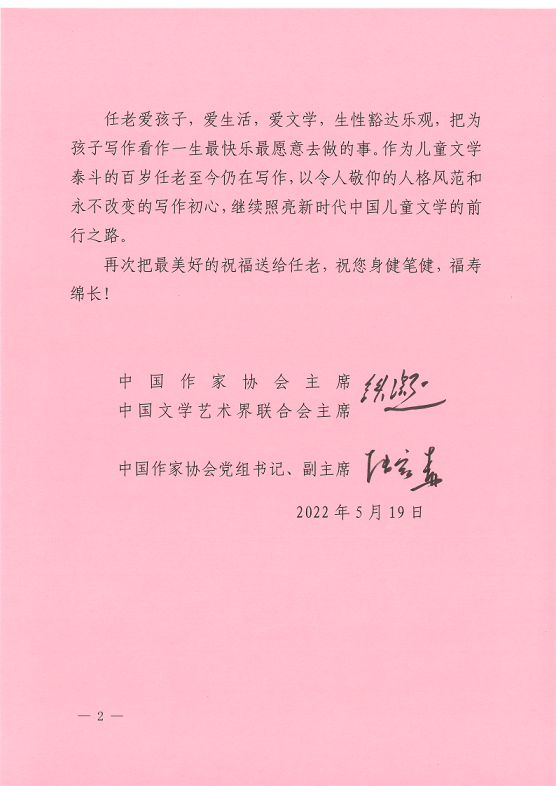 中國(guó)作協(xié)賀信中寫(xiě)道,任老學(xué)貫中西,童心永駐,八十載筆耕不輟,在兒童文學(xué)翻譯、創(chuàng)作和出版領(lǐng)域成就斐然,為兒童文學(xué)事業(yè)做出了杰出貢獻(xiàn)。他把世界兒童文學(xué)經(jīng)典帶到了中國(guó)讀者手中,滋養(yǎng)了一代又一代中國(guó)孩子的精神成長(zhǎng),也為眾多創(chuàng)作者開(kāi)啟了全球視野和世界眼光。任老在創(chuàng)作上也影響巨大,獲獎(jiǎng)無(wú)數(shù)。兒童詩(shī)和童話幽默風(fēng)趣,膾炙人口,以其對(duì)童年精神的深刻理解獲得了孩子們的喜愛(ài)。賀信中說(shuō):“任老愛(ài)孩子,愛(ài)生活,愛(ài)文學(xué),生性豁達(dá)樂(lè)觀,把為孩子寫(xiě)作看作一生最快樂(lè)最愿意去做的事。作為兒童文學(xué)泰斗的百歲任老至今仍在寫(xiě)作,以令人敬仰的人格風(fēng)范和永不改變的寫(xiě)作初心,繼續(xù)照亮新時(shí)代中國(guó)兒童文學(xué)的前行之路。……把最美好的祝福送給任老,祝您身健筆健,福壽綿長(zhǎng)!”
