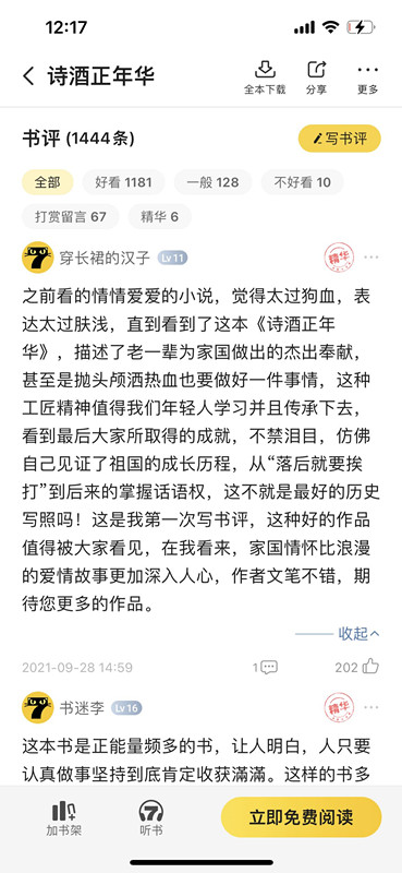 棠花落:要說最滿意的,其實(shí)是什么獎(jiǎng)都沒有拿到的《詩酒正年華》。這是我付出心血最多的一部作品,篇幅也是最長的。它的故事性,是四部現(xiàn)實(shí)題材作品中我最滿意的,連載的時(shí)候有很多讀者反饋,留言區(qū)里最年長的讀者是“50后”。