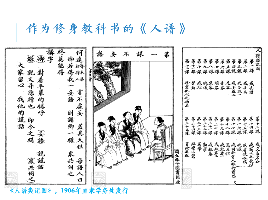1904年初,癸卯學(xué)制對(duì)修身的目的及教法有更細(xì)致的規(guī)定。初等小學(xué)堂摘講朱子《小學(xué)》、劉宗周《人譜》及各種養(yǎng)蒙圖說(shuō),讀有益風(fēng)化之古詩(shī)歌,為兒童立“愛(ài)國(guó)家之根基”[10]。在師資稀缺的地區(qū),另立“簡(jiǎn)易科”,將修身課與讀經(jīng)課合而為一,于講經(jīng)時(shí)帶講修身?!蹲喽ǔ醯刃W(xué)堂章程》對(duì)修身科的設(shè)想,有三點(diǎn)值得注意:一是把明儒劉宗周的《人譜》作為修身教科書(shū)[11],二是以諷誦古詩(shī)歌作為幼童涵養(yǎng)性情之道[12],三是修身與讀經(jīng)在鄉(xiāng)野之地可合并講授。高等小學(xué)堂的修身科,每星期2鐘點(diǎn),講授“四書(shū)”要義,“以朱注為主,以切于身心日用為用”;共四學(xué)年,每年修身科的課程內(nèi)容相同,而讀經(jīng)講經(jīng)科則有程度之遞進(jìn),從《詩(shī)》《書(shū)》到更艱深的《易經(jīng)》及《儀禮》節(jié)本,每周課時(shí)是修身科的6倍。[13]