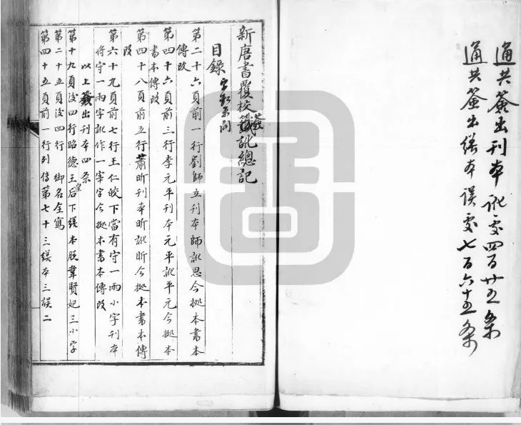 頗為吊詭的是,《校檔》中書名題署為“新唐書復(fù)校簽訛總記”的一頁上還題有“(乾?。┧氖辏┲廖逶鲁醢巳珍N訖,送總裁,發(fā)下銷訖,又查存疑簽,辦過一半”(見圖4),據(jù)此可知,《校檔》于乾隆四十六年五月仍在四庫館銷簽,因而纂定時(shí)間必當(dāng)延續(xù)至此。又查《四庫全書薈要》史部正史類收錄《新唐書》,其提要的校上時(shí)間為乾隆四十二年正月[10],是知《新唐書》于乾隆四十二年正月前已經(jīng)辦理完竣并繕入《四庫全書薈要》,這便與《校檔》登載的《新唐書》于乾隆四十六年五月初八日的銷簽記錄相違伐?!缎绿茣冯m經(jīng)過分校官校閱,于乾隆四十二年抄入《薈要》,但由于《四庫全書》仍在編纂,《新唐書》又經(jīng)四庫館臣校訂,直至謄抄定本,故而《校檔》中保留了兩次《新唐書》校改記錄?!缎n》中第一次《新唐書》簽改注明“薈要”,應(yīng)屬于“薈要處”校閱《新唐書》時(shí)的復(fù)校記錄,而第二次簽改作《新唐書復(fù)校簽訛總記》,應(yīng)該是“全書處”進(jìn)行的復(fù)校,第二次簽訛時(shí)書名中增加“復(fù)校簽訛總記”六字,題名差異恰能反映兩次簽訛的區(qū)別。再從兩次簽改的具體內(nèi)容來看:第一次作“繕本《考證》一頁三行應(yīng)加〇,馀無誤。刊本無簽”,第二次作“刊本無訛。三頁后二行‘扂’誤‘居’,八頁六行‘臣’誤‘誠’,以上簽出繕本二條”。對比前后兩次的內(nèi)容,《新唐書》的謄錄者已經(jīng)部分采納了第一次簽改的意見;館臣第二次校簽時(shí),刪去了加〇的內(nèi)容,并補(bǔ)充多條有關(guān)繕本《新唐書》的訛誤。再如第一次簽改中卷二百二十二下與卷二百二十三上皆著錄“苻堅(jiān)誤作符堅(jiān)”;第二次簽改卷二百二十三上時(shí),四庫館臣用墨筆勾乙刪去此條。由此可知《新唐書》第二次內(nèi)容較第一次有所刪改。據(jù)此,《校檔》中登載乾隆四十六年五月《新唐書》仍在四庫館銷簽,應(yīng)屬于全書處復(fù)校流程,與薈要處無涉。