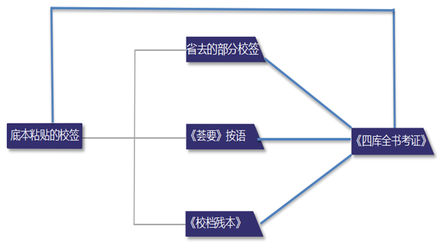 值得注意的是,校檔還與《四庫全書考證》的編纂密切相關(guān)。相關(guān)研究表明,《考證》乃是館臣擇取黃簽匯編而成,而黃簽其實(shí)就是校簽的一種,只不過由于需要進(jìn)呈御覽,所以區(qū)別于一般校簽[24]?!缎n》中《新唐書》和《釋音》后有“凡黃簽須明白曉暢,進(jìn)呈時(shí)一覽了然,若重沓支離,均不足取,倘太簡略,又不可以此籍口急索解,人不可得尚其旦暮遇之”,據(jù)此可知,《校檔》是黃簽加工過程中的載體之一,很可能是《四庫全書考證》成書過程中的重要一環(huán)。循此路徑,將《考證》與《校檔》的校簽一一核對,發(fā)現(xiàn)二者并不能完全對應(yīng)。除《考證》所錄《新唐書》與《釋音》的簽改意見均能在《校檔》中找到出處外,其他各書的簽訛內(nèi)容,皆互有異同。由于《校檔》中《新唐書》與《釋音》抄寫工整,且抄紙有界欄,與各書不同,猜測這兩書應(yīng)是復(fù)校核對簽訛記錄后,重新謄抄的較為整飭的內(nèi)容,因此在編纂《考證》時(shí)可直接從中選擇黃簽。而且,《四庫全書薈要》中的按語,也與《校檔》或《四庫全書考證》多有不同。筆者認(rèn)為這三種簽改內(nèi)容,皆由粘貼在底本上的校簽轉(zhuǎn)化而來,在《薈要》與《四庫全書》的編纂過程中,有些底本上的校簽作為按語抄入《薈要》,部分內(nèi)容則移錄至校檔。館臣自底本校簽、《薈要》按語、校檔中選擇校簽加工成黃簽,再將黃簽匯編成《四庫全書考證》,具體的流程或如下圖: