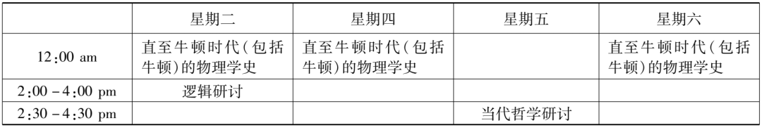 而“哲學(xué)23a2號課”的課名是“哲學(xué)方法”(philosophic method),依然是協(xié)佛開的課。它是大類課程“哲學(xué)23號課”(Philosophy 23)的分支課,“哲學(xué)23號課”之總名為“知識理論”(theory of knowledge),其目標(biāo)是對與知識的方法、效度(validity)和限度(limits)有關(guān)的一些基本問題進(jìn)行邏輯分析。這七門課程中,兩門科學(xué)史課程和“哲學(xué)中的實(shí)用主義運(yùn)動”是通修課,余下的其他課程則全是研究生基礎(chǔ)課。趙元任這個學(xué)年的課程表(見表4、表5)也可以通過綜合這些課程的上課時間重新列出。