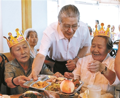人藝《甲子園》劇組到香山老年公寓體驗生活,藍(lán)天野為壽星送飯(攝于2012年7月9日)