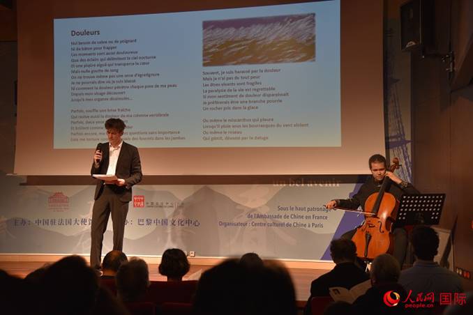 法國(guó)青年演員凡維登在悠揚(yáng)的琴聲中朗誦中文詩(shī)歌的法語翻譯版 轉(zhuǎn)自人民網(wǎng) 記者劉玲玲 攝