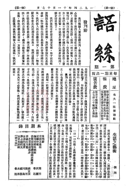 現(xiàn)有的日報附張或小報大抵有四種式樣。第一種《自由談》,《快活林》,《小時報》等無論矣;時事新報的《學燈》,北京晨報的副刊代表第二種;《向?qū)А芳懊駠請蟮摹队X悟》代表第三種;北大研究所的《歌謠周刊》,以及《綠波》,《狂飆》等代表第四種。第四種最好,可惜印刷工人和讀者兩方面都不大習慣,所以只好暫緩采用。二三兩種之間,第二種似乎較好,但篇幅太大,合訂時翻閱非常不便。所以我們決定采第三種。但又頗以《覺悟》每行的字數(shù)為太多了,或者太費閱者眼力,所以兼采《語絲周刊》的短行制。