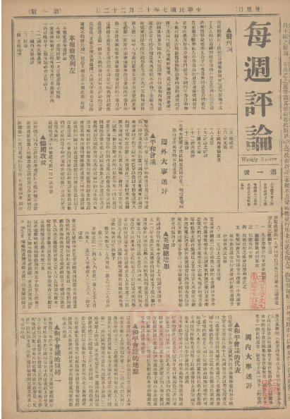 [17] “看《新青年》的,不可不看《每周評論》。1 《新青年》里面都是長篇文章?!睹恐茉u論》多是短篇文章。2 《新青年》里面所說的,《每周評論》多半沒有?!睹恐茉u論》所說的,《新青年》里面也大概沒有。3 《新青年》是重在闡明學理?!睹恐茉u論》是重在批評事實。4《新青年》一月出一冊,來得慢?!睹恐茉u論》七天出一次,來得快?!保ā缎虑嗄辍?918年12月15日第5卷第6號)