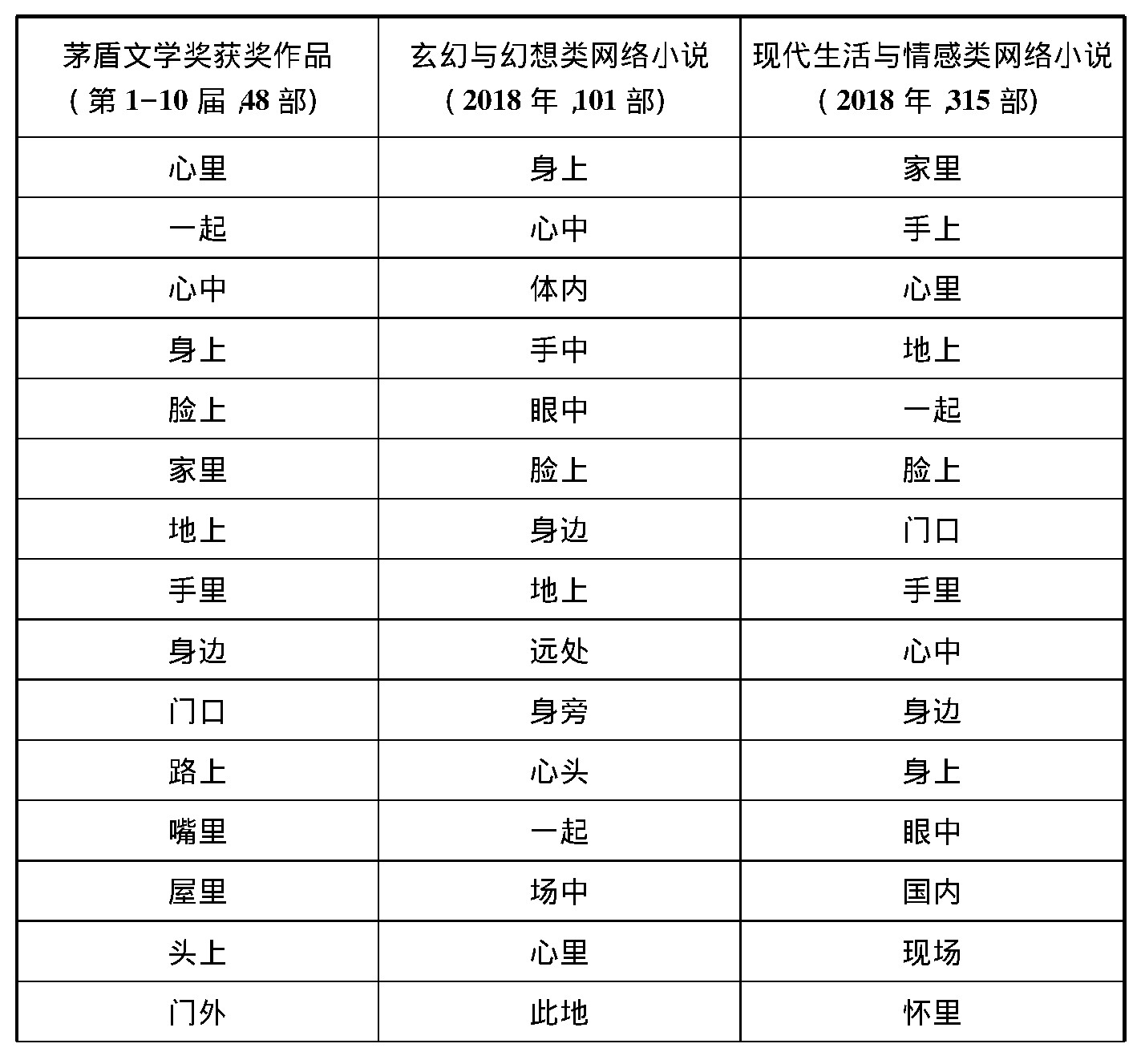 在歷屆茅盾文學(xué)獎(jiǎng)獲獎(jiǎng)作品的場景高頻詞統(tǒng)計(jì)結(jié)果中,一方面,“心里”是當(dāng)之無愧的第一高頻詞,在統(tǒng)計(jì)數(shù)值上遙遙領(lǐng)先于后面其他場景的高頻詞4,而且其近義詞“心中”也排在第三位。另一方面,具體到針對每部獲獎(jiǎng)作品的分析數(shù)據(jù)中,我們也發(fā)現(xiàn)“心里”作為場景高頻詞普遍排位較高的情況,其中“心里”作為第一場景高頻詞的作品有28部,作為第二場景高頻詞的作品有10部,作為第三場景高頻詞的作品有2部,此外還有2部作品的第一場景高頻詞為“心中”———即“心里”的同義詞。5而在2018年中國101部玄幻與幻想類網(wǎng)絡(luò)小說的場景高頻詞統(tǒng)計(jì)結(jié)果中,“心里”的次序則比較靠后(僅為第14位),而與其意思相近的“心中”“心頭”排名則相對靠前,分別為第2和第11位。在2018年中國315部現(xiàn)代生活與情感類網(wǎng)絡(luò)小說的場景高頻詞統(tǒng)計(jì)結(jié)果中,“心里”和其近義詞“心中”則分別位列第3和第9。