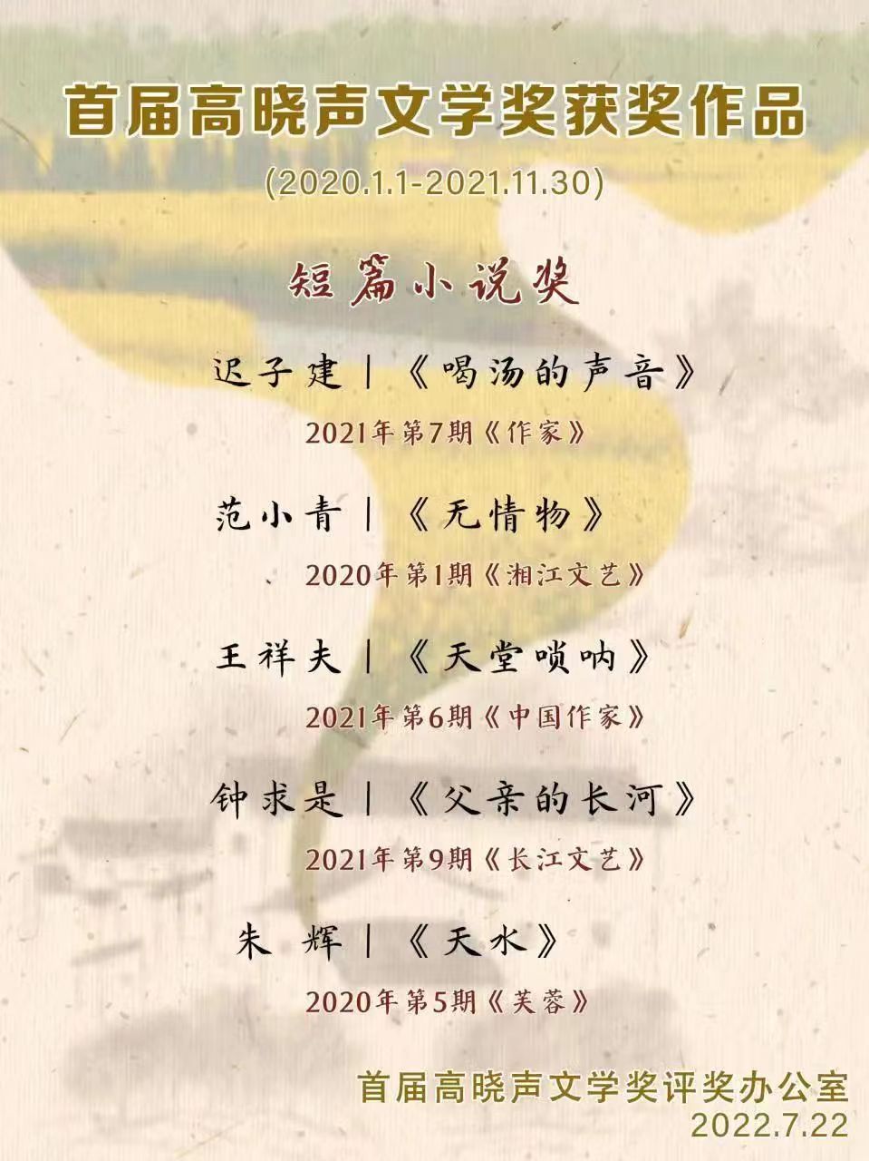 7月22日,首屆高曉聲文學(xué)獎在江蘇省常州市揭曉,《有生》《空山》《喝湯的聲音》等10部(篇)作品分獲長篇小說獎、中篇小說獎、短篇小說獎。江蘇省作家協(xié)會黨組成員、書記處書記、副主席丁捷,常州市委宣傳部副部長、市新聞出版局(版權(quán)局)局長謝春林,常州市文聯(lián)黨組書記、主席舒文,南京大學(xué)教授王彬彬,江蘇鳳凰文藝出版社原社長黃小初等出席首屆高曉聲文學(xué)獎新聞發(fā)布會。發(fā)布會由常州市委宣傳部四級調(diào)研員王志新主持。