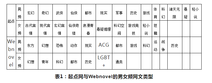 網(wǎng)絡(luò)文學(xué)在Webnovel上的“亮相”呈現(xiàn)出直接顯性的東亞化與國際化特點(diǎn)。在題材分類上,Webnovel選用了英文讀者較為熟悉的類型小說分類,且在一定程度上呼應(yīng)世界新興審美價(jià)值取向(見表1)。