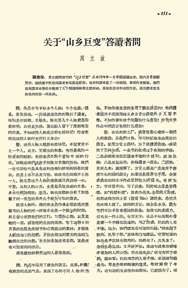 著名作家周立波代表作長篇小說《山鄉(xiāng)巨變》在《人民文學(xué)》1958年1至6月號連載推出,引發(fā)了廣泛的關(guān)注和熱烈的討論。六個月內(nèi),編輯部不斷收到讀者來信,給出好評,也有部分讀者提出了一些相關(guān)的疑問,希望作者解答?!度嗣裎膶W(xué)》編輯部根據(jù)讀者來信,綜合整理了幾個問題轉(zhuǎn)給周立波,并在當(dāng)年7月號刊出《關(guān)于“山鄉(xiāng)巨變”答讀者問》一文,將讀者意見與作家的回答一并發(fā)表。