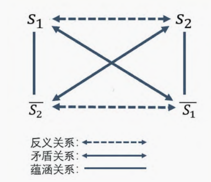 格雷馬斯在列維-斯特勞斯所提出的二元對立結構上增加了兩個語義素,以四個語義素之間的相互關系來構造敘事的深層邏輯,四項語義素之間的彼此作用與動態(tài)轉化促使意義生成。這一符號方陣又成為格雷馬斯的“意義矩陣”。如圖1所示。